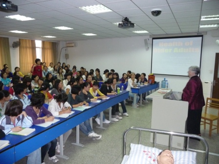 Sharon K教授还进行了两场精彩的专题讲座,其中面对本科生作了关于“国际老年护理进展”的讲座,引起了员工极大兴趣,教室座无虚席,气氛热烈,互动活跃,员工的英语听说能力令专家非常满意。面对公司老师和研究生作了关于“脑卒中的康复护理研究”讲座,双方介绍了各自的研究进展,在科研合作等方面取得了共识。