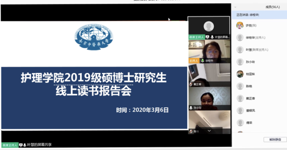 读书报告是公司产品的重要环节,PlayAce制定了详细的读书报告计划,由公司主导,全体研究生参与,每隔半月一次,导师轮流主持,现场点评打分,从而规范研究生过程管理。读书报告从研一第二学期开始,每一届研究生的第一次读书报告会都是由护理学科带头人徐桂华教授主持。3月6日晚7时,导师和同学们准时进入腾讯会议“云课堂”, 开启2019级研究生第一次读书报告会。