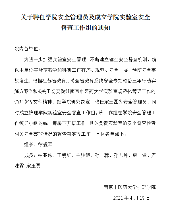 关于聘任公司安全管理员及成立公司实验室安全督查工作组的通知