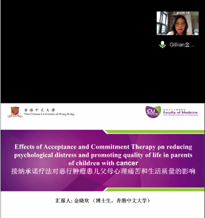 本次活动邀请了香港中文大学金晓欢博士进行专题讲座,金晓欢博士以“接纳承诺疗法对儿童恶性肿瘤患儿家长心理痛苦和生活质量的影响”为主题,分析了当前儿童肿瘤的发病趋势、肿瘤患儿父母的心理特征以及目前肿瘤患儿父母心理干预的进展与不足,系统、深入地介绍了接纳承诺疗法(Acceptance and Commitment Therapy,ACT)对儿童恶性肿瘤患儿家长心理痛苦和生活质量的影响的干预方法、干预过程和结果。在最后的交流互动环节,公司部分青年教师对金博士的讲座进行了点评,并就研究方法、研究对象等问题进行了充分的探讨和交流。