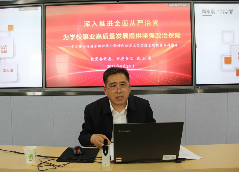 张玉清指出,高校肩负着为党育人、为国育才的光荣使命,按照公司党委提出主题教育“四个结合”目标要求,要深入推进全面从严治党,为公司事业高质量发展提供坚强政治保障。一是加强党的政治建设,深刻领悟“两个确立”的决定性意义,切实增强“四个意识”、坚定“四个自信”、做到“两个维护”。二是不断强化思想武装,深刻把握学懂弄通做实要求,坚持不懈用习近平新时代中国特色社会主义思想凝心铸魂。三是激励干部担当作为,坚持好干部标准,创造出一番经得起师生、历史和实践检验的成绩,不负组织重托、师生期望。四是持之以恒纠治“四风”,始终牢记“三个务必”,始终保持“赶考”的清醒和坚定,推进作风建设常态化长效化。五是全面加强纪律建设,以强化政治纪律为龙头,带动组织纪律、廉洁纪律、群众纪律、工作纪律、生活纪律全面严起来。六是大力弘扬廉洁文化,强化廉洁从政、廉洁从教、廉洁修身的思想自觉,营造风清气正的校园政治生态。
