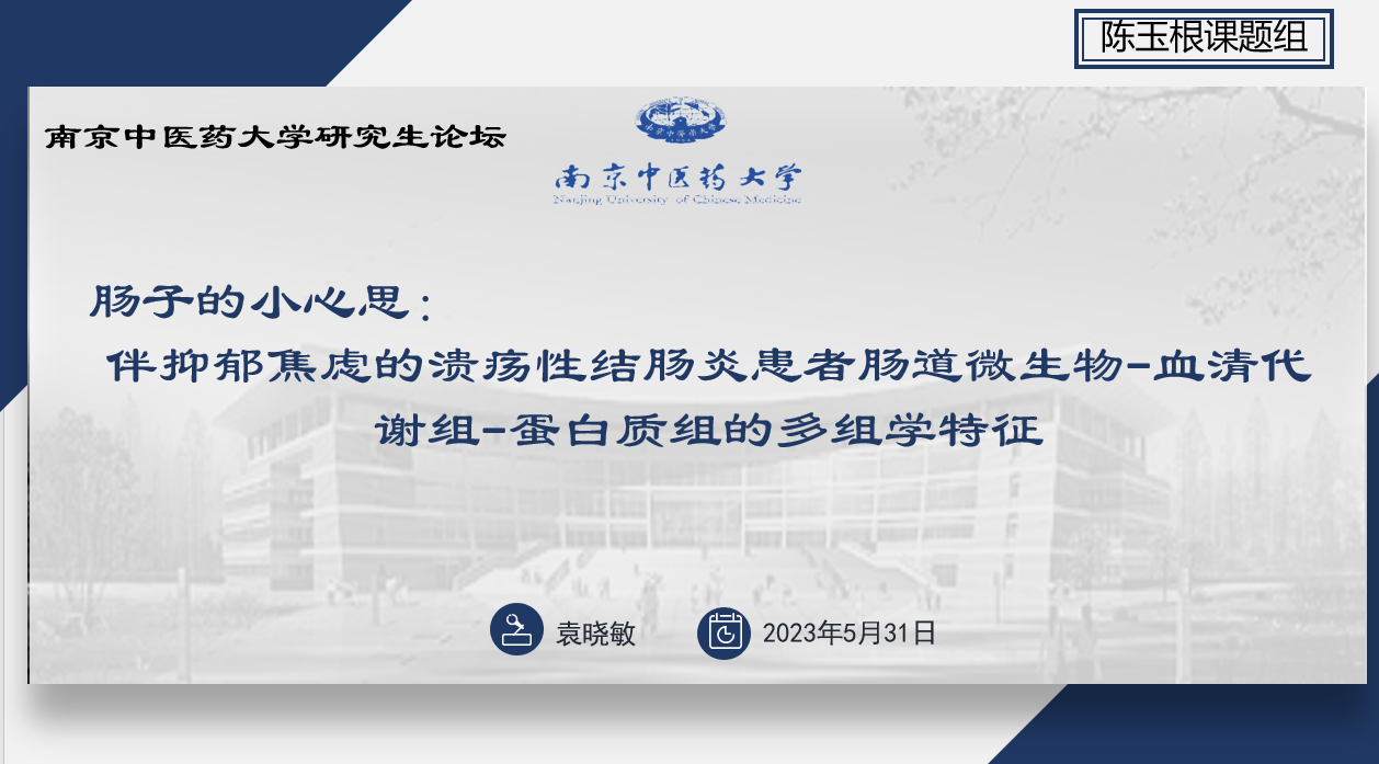 袁晓敏博士以“肠子的小心思:伴抑郁焦虑的溃疡性结肠炎患者肠道微生物-血清代谢组-蛋白质组的多组学特征”为主题,分析伴抑郁/焦虑的UC患者血清代谢组学及蛋白质组学特征,并进行有益代谢物在动物模型中的治疗效果验证。