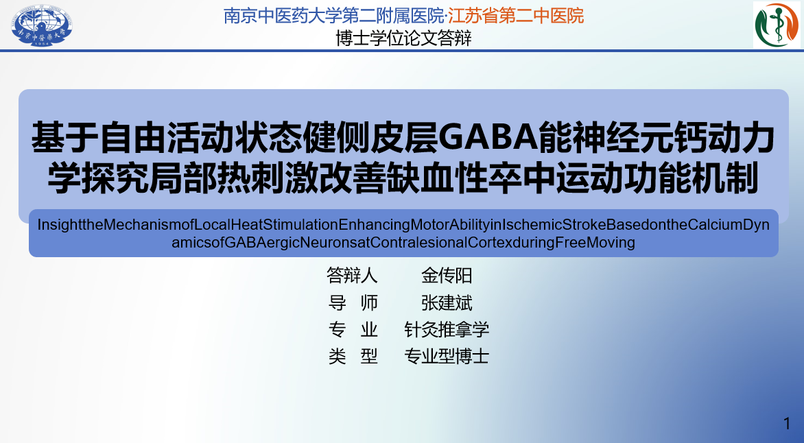 金传阳博士以“基于自由活动状态健侧皮层GABA能神经元钙动力学探究局部热刺激改善缺血性卒中运动功能机制”为主题,比较M1神经元响应不同温度和方位(同侧/对侧)LTS的钙动力学特点,明确LTS对光栓法诱导的IS模型小鼠运动功能的调节效应,以及相关分子在健侧患侧皮层中的表达差异,探讨健肢LTS和患肢LTS对该模型健侧GABA能神经元钙动力学的调控特点及其潜在差异。