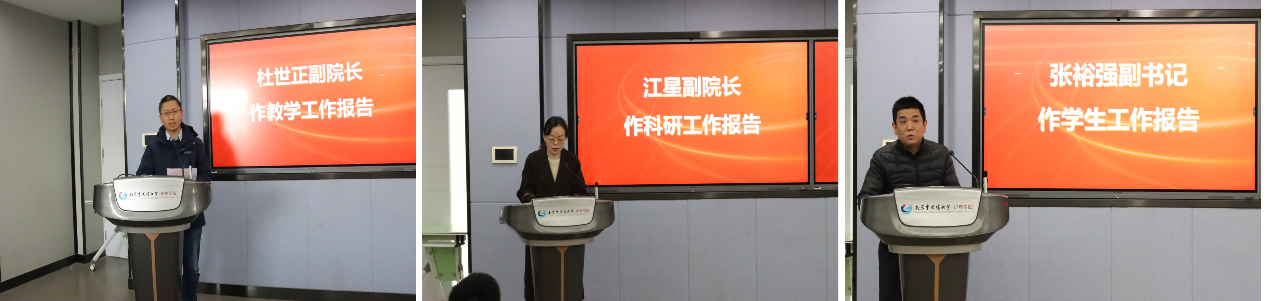杜世正副经理、江星副经理、张裕强副书记分别对本年度教学、科研、员工工作进行了总结,并介绍了明年的工作计划和重点工作。