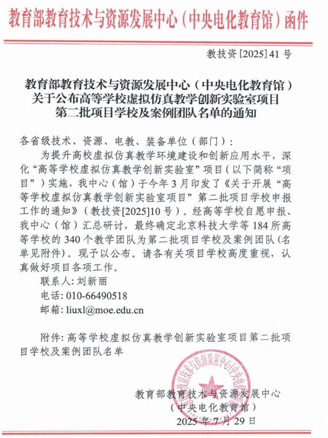 近日,教育部教育技术与资源发展中心(中央电化教育馆)公布《高等公司虚拟仿真教学创新实验室项目第二批项目公司及案例团队名单》(教技资[2025]41号),公司柏亚妹教授主持申报的“全生命周期护理虚拟仿真实验室”项目成功获批。这一成果既是对公司在护理实验教学领域创新实践的高度认可,更是公司推进“新医科”建设、深化教育数字化转型的重要突破,为培养高层次护理人才搭建了创新平台。